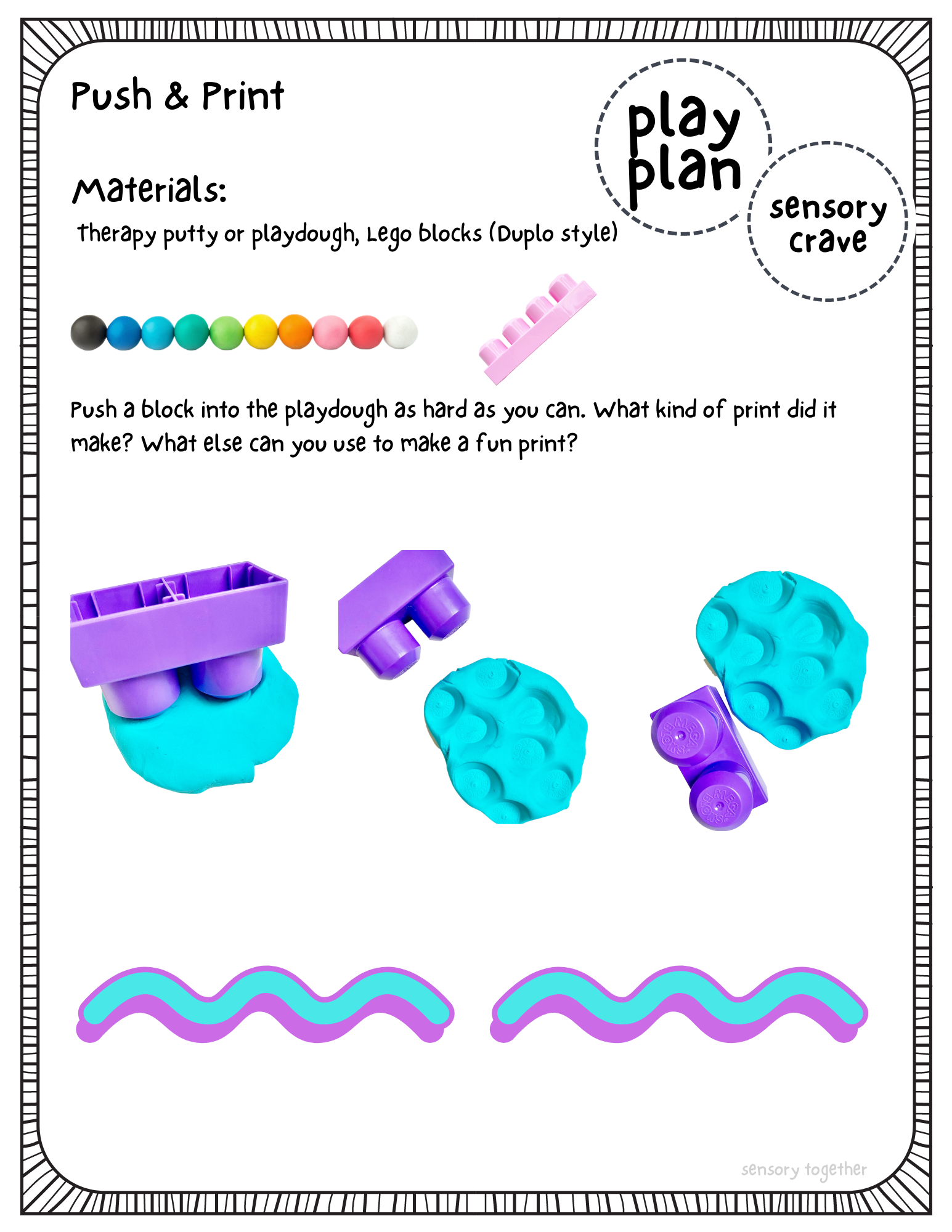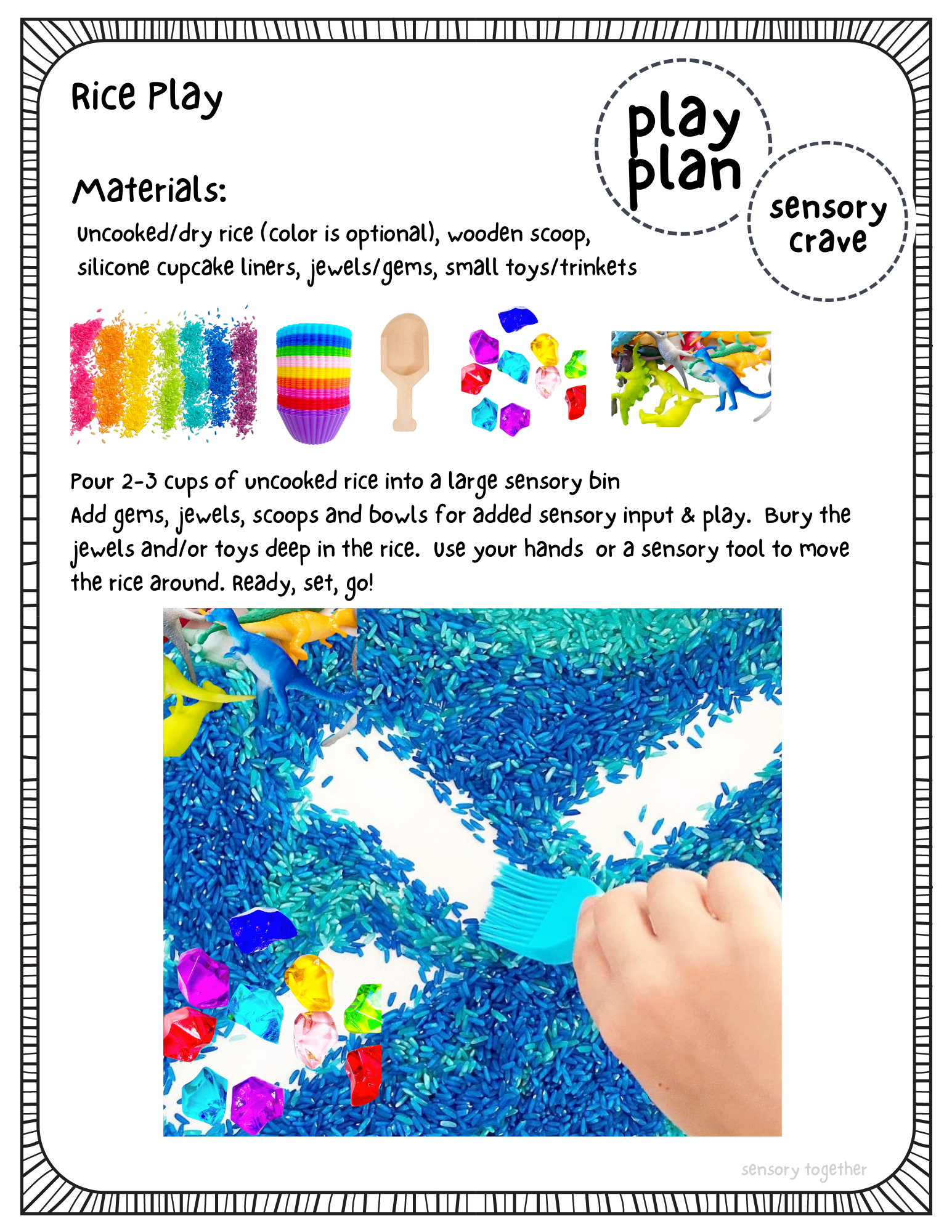 - A complete set of DIGITAL PLAY PLANS that show you exactly how to use our preferred materials, complete fine and gross motor tasks, yoga, imagery, progressive muscle relaxation tasks & more. Play Plans are instructional activity cards that are both developmentally appropriate and kid-friendly. They provide guided play and information on length of engagement time. Play plans also address specific sensory gross motor activities to ensure overall sensory stimulation.