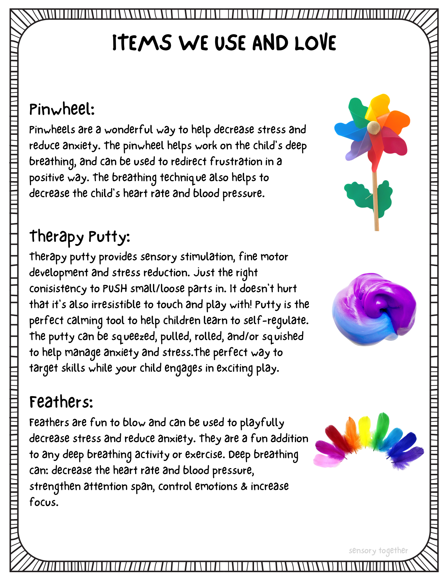 - A complete set of DIGITAL PLAY PLANS that show you exactly how to use our preferred materials, complete fine and gross motor tasks, yoga, imagery, progressive muscle relaxation tasks & more. Play Plans are instructional activity cards that are both developmentally appropriate and kid-friendly. They provide guided play and information on length of engagement time. You will receive 36 plans.
